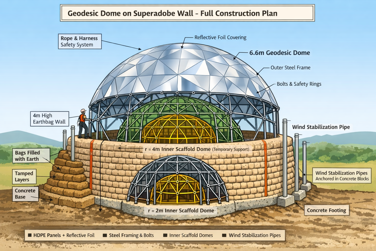 Wind-safe: 36 steel pipes anchored to concrete + earthbags stabilize dome under 1 kPa lateral wind.